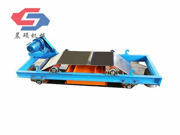 電磁除鐵器的基礎(chǔ)上增加了驅(qū)動(dòng)電機(jī)、滾筒、帶刮板的缷鐵膠帶等組成的缷鐵機(jī)構(gòu)。在工作過程